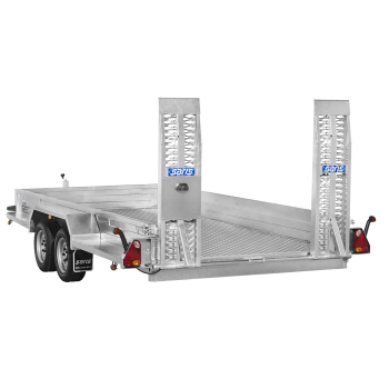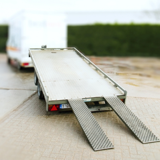 Deze zware aanhangwagen is specifiek gebouwd voor het vervoeren van auto’s, motors of gelijkaardige machines. Ze wordt voorzien van oprijplanken.